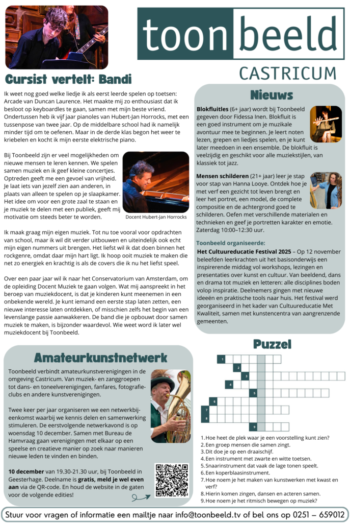 Misschien heb je het al gezien: de afgelopen maanden hebben we op de achterpagina van de krant gestaan! Met verhalen van cursisten, scholen, informatie over cursussen en leuke puzzels. Dit is de pagina van november 2025. Veel leesplezier!